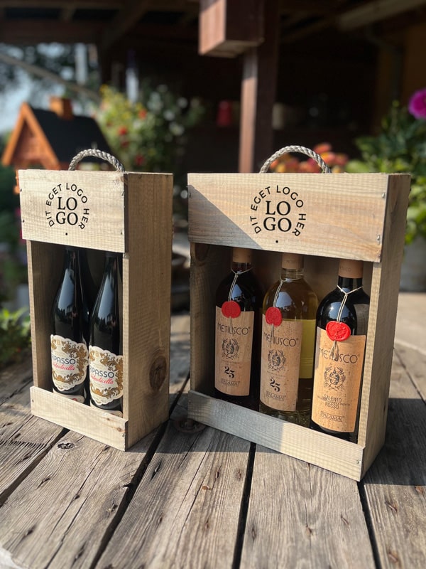 Vi har egen trykafdeling og kan tilbyde, at trykke med flere farver på alle former for kasser. Du leverer selv flaskerne.